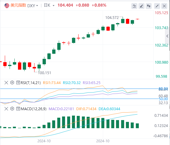 10月28日,北京时间周一亚市早盘,美元指数徘徊在104.4附近。上周五,美元指数先跌后涨,盘中一度失守104关口,但其在美盘时段强势拉涨,收复日内全部失地,最终收涨0.35%,为连续第四周收涨,报104.38。美债收益率有所回升,基准的10年期美债收益率收报4.2460%;对货币政策更敏感的两年期美债收益率收报4.1220%。现货黄金盘中一度失守2720关口,但在美盘前大幅回升,并一度涨至2747.69美元的日内高点,较日低大涨超30美元,最终收涨0.41%,报2746.92美元/盎司。现货白银在美盘前有所上涨,但随后回吐日内全部涨幅,最终收跌0.01%,报33.66美元/盎司。周一,现货黄金开盘跳空低开15美元。由于投资者对中东持续不断的冲突以及下个月的美国大选进行了评估,原油上周五收高,WTI原油重回70美元关口上方,最终收涨1.88%,报71.54美元/桶;布伦特原油收涨1.76%,报75.53美元/桶。周一,原油开盘大跌,WTI原油跌超4%,一度跌至68美元下方;布伦特原油同样跌超4%,至72美元附近。