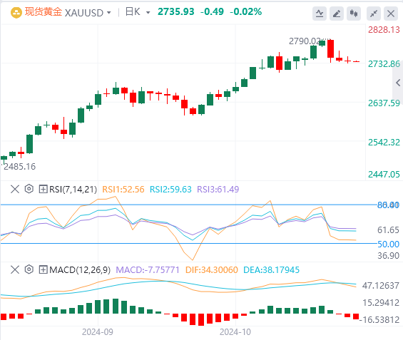 周二亚盘,黄金交投于2735.93附近。金价周一接近收平,收报2736.48美元/盎司,因美国大选的不确定性近在眼前,市场观望情绪渐浓,投资者对有争议的选举结果和政治紧张局势的可能性进行了定价,同时投资者还密切关注本周晚些时候的美联储政策会议。