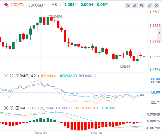 英镑:截止发稿,英镑/美元徘徊于1.2954附近。英镑/美元上周一下跌,收报1.2957,跌幅0.23%。交易员将密切关注美国总统大选的结果。周四,注意力将转移到英格兰银行(BoE)和美国联邦储备委员会(Fed)的货币政策决定上。在英镑方面,接受路透社调查的经济学家预测,英国央行周四的利率决定将基准利率下调25个百分点至4.75%。技术面上,目前,英镑/美元正试图收于50MA下方1.2960。如果这次尝试成功,英镑/美元将走向下一个支撑位1.2870–1.2880。