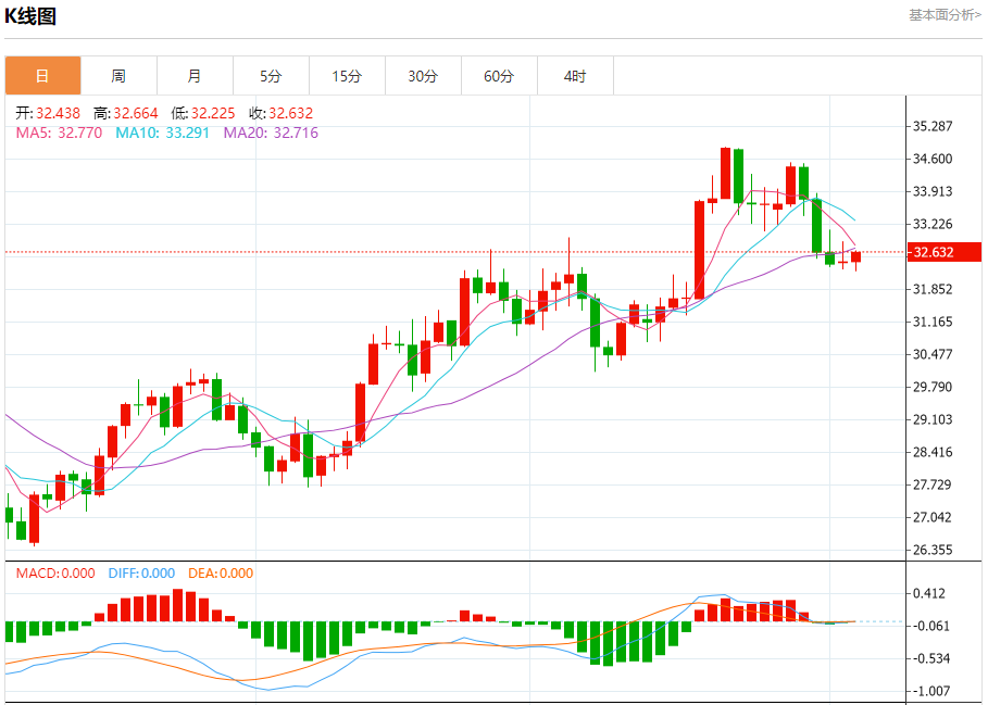 现货白银:截止北京时间21:20,现货白银上涨,现报32.626,涨幅0.59%。纽市盘前,除了随机积极因素之外,白银价格现在还受到图表上出现的看涨通道支撑线强度的影响,可能会测试33.04美元,然后再次转向下跌。