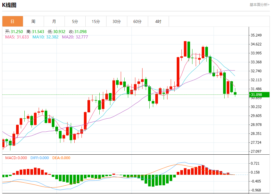 现货白银:截止北京时间21:12,现货白银下跌,现报31.040,跌幅0.77%。纽市盘前,银价显示负交易远离31.63美元水平,并支持在日内继续预期的熊市趋势的机会,实现下一个目标30.63美元的道路是开放的,这代表了从26.41美元上升到34.85美元的50%斐波纳契修正水平,因此,突破它将推动价格遭受额外的损失,达到29.64美元。