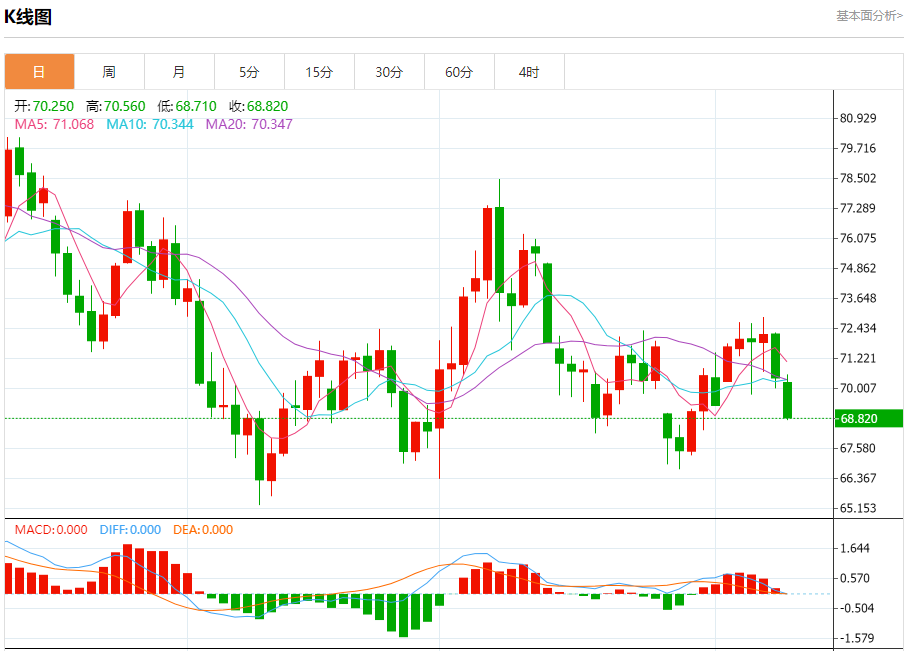 原油市场:截止北京时间21:12,美油下跌,现报68.880,跌幅2.13%。纽市盘前,原油价格上周五收于70.58美元下方,强化了日内继续看跌趋势的预期,等待访问68.64美元,这是我们的下一个负面目标,受到EMA50下方的支撑。