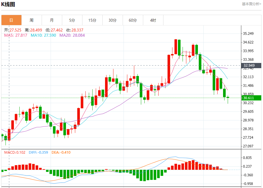 现货白银:截止北京时间21:20,现货白银下跌,现报30.600,跌幅0.20%。纽市盘前,白银价格显示出新的负面交易,以恢复修正的熊市轨道,实现我们下一个等待的目标29.64美元的道路是开放的,注意到打破它将推动价格遭受更多损失,延伸到28.40美元,而熊市波的持续取决于价格稳定在30.63美元以下,最重要的是在31.63美元以下。