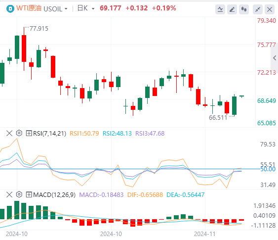 技术面:技术上,金价如预期般恢复上行,为反弹打开大门。随着金价升至10月10日波动低点2603美元/盎司上方,买家出现,并关注50日移动均线2653美元/盎司。在此之后,金价进一步阻力位在2700美元/盎司附近。若突破该位,这将为金价升至11月7日的高点2710美元/盎司铺平道路。另一方面,一旦金价跌破11月14日的波动低点2536美元/盎司,黄金将进一步下跌。但首先,交易者将面临100日简单移动平均线(SMA)2547美元/盎司。一旦失守这两个水平,金价的下一个支撑位将是2500美元/盎司。