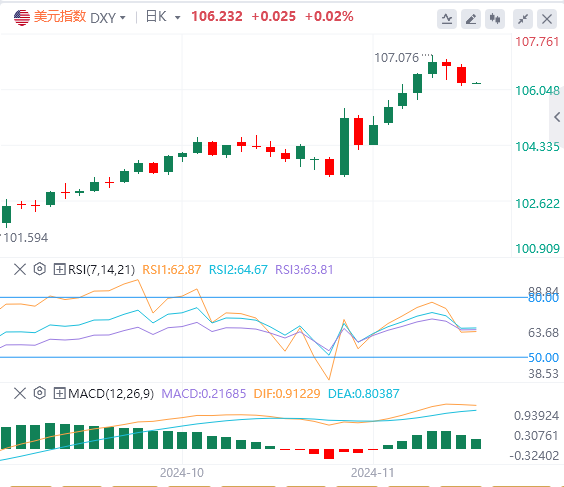 11月19日,北京时间周二亚市早盘,美元指数徘徊在106.23附近。周一,美元指数震荡下跌,盘中一度触及106.81,最终收跌0.44%,报106.21。基准的10年期美债收益率收报4.4210%;对货币政策更敏感的两年期美债收益率收报4.2890%。因美元大涨势头停滞,且俄乌冲突的不确定性加剧重新引发了避险需求,现货黄金在六连跌后于周一急升,日内一度大涨50.10美元,最终收涨1.91%,报2611.61美元/盎司。现货白银最终收涨2.96%,报31.13美元/盎司。因俄乌冲突升级,上周日俄罗斯对乌克兰发动了近三个月来最大规模的空袭,国际油价大涨。WTI原油最终收涨3.22%,报69.05美元/桶;布伦特原油收涨3.06%,报73.17美元/桶。