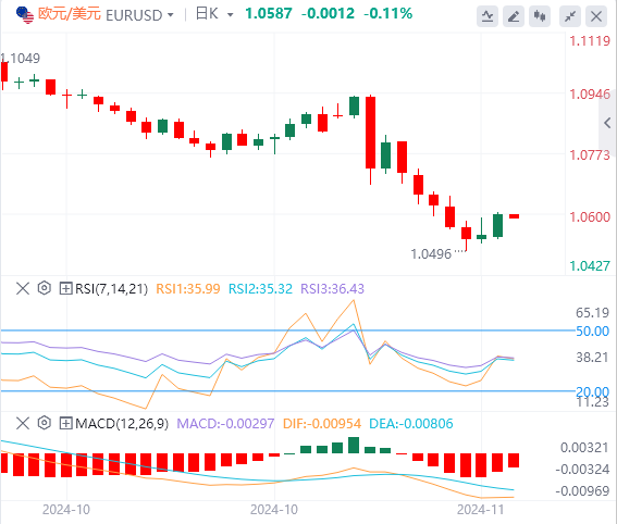 欧元:截止发稿,欧元/美元徘徊于1.0587附近。欧元/美元周一上涨,收报1.0599,涨幅0.55%。欧元/美元周二短暂测试了1.0600下方,继从9月份创下的1.1200紧上方这一数月高点快速下跌七周之后,有望进一步下跌。由于缺乏重要的以欧盟为中心的经济数据,尽管欧元区交易者将期待周四的泛欧盟国内生产总值(GDP)更新,但美元波动仍主导欧元后市。美国10月通胀数据将于周三发布,市场预计总体消费者物价指数年率将出现反弹。技术面上,如果欧元/美元成功收于1.0600水平上方,它将向下一个阻力位1.0650–1.0670移动。