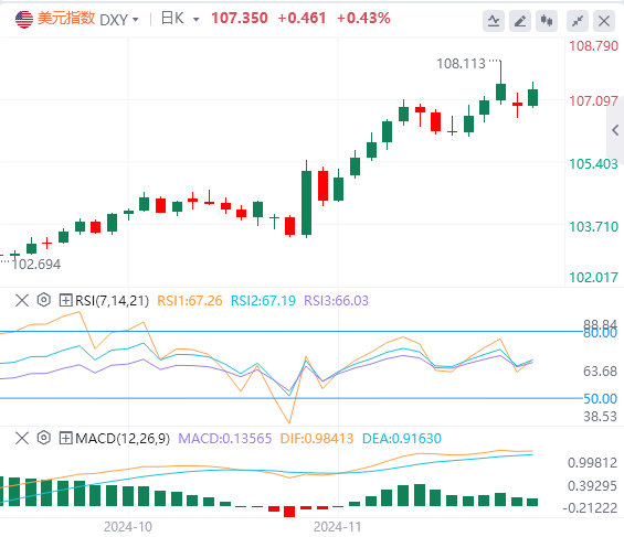 美元指数:截止发稿,美元指数徘徊在107.35附近。交易员等待美国国内生产总值(GDP)和个人消费支出(PCE)通胀数据提供指引。黄金价格一度下探2605美元,随后回升至2611美元维持疲软,美国总统拜登和法国总统马克龙传将宣布以色列与真主党停火。技术面上,如果美元指数回升至107.10–107.30的阻力位上方,它将向下一个阻力位108.70–108.90移动。