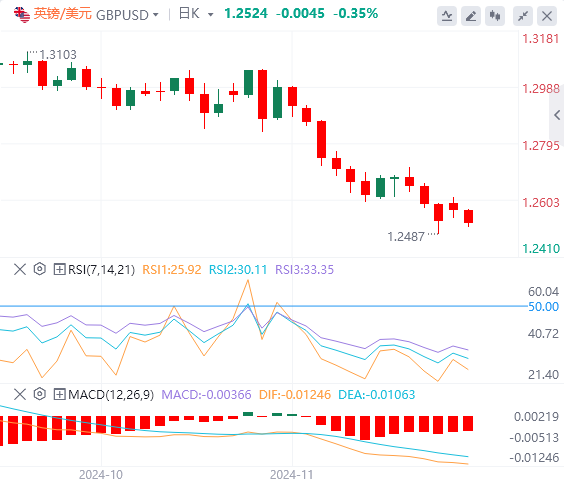 英镑:截止发稿,英镑/美元徘徊于1.2524附近。英镑/美元上周一下跌,收报1.2569,跌幅0.30%。本周英国经济事件有限,而周三新公布的美国关键通货膨胀数据后,美国市场本周交易时段缩短,因为美国人正在为感恩节假期做准备。技术面上,跌破1.2510水平将为测试下一个支撑位1.2435–1.2450开辟道路。