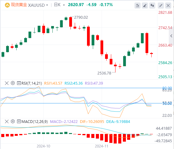 周二亚盘,黄金交投于2620.97附近。在周一的交易中,美元需求增加,得益于美国指数的强劲表现和令人鼓舞的美国数据。该国报告称,10月份芝加哥联储全国活动指数下降了0.4,前值为上修后的-0.27。同时,11月达拉斯联储制造业商业指数为-2.7,略好于之前的-3。