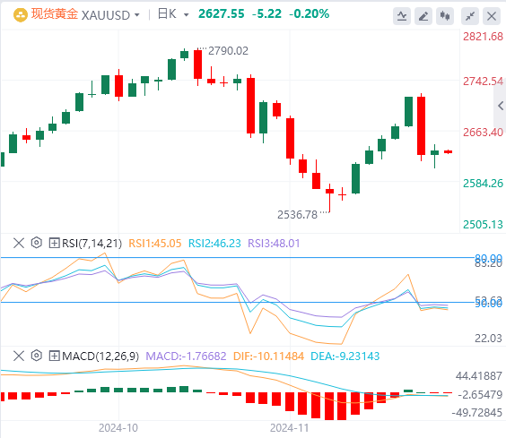 周三亚盘,黄金交投于2627.55附近。在周一的交易中,美元需求增加,得益于美国指数的强劲表现和令人鼓舞的美国数据。该国报告称,10月份芝加哥联储全国活动指数下降了0.4,前值为上修后的-0.27。同时,11月达拉斯联储制造业商业指数为-2.7,略好于之前的-3。