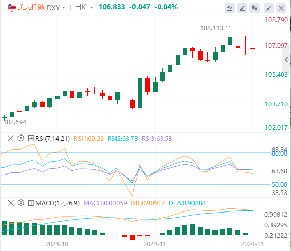 11月27日,北京时间周三亚市早盘,美元指数徘徊在106.83附近。周二,因特朗普誓言要对加拿大、墨西哥和中国征收关税,美元指数小幅反弹,最终收涨0.06%,报106.90。基准的10年期美债收益率收报4.3100%;对货币政策更敏感的两年期美债收益率收报4.2580%。因美联储“大鹰派”称对下个月再次降息持开放态度,金价回升,现货黄金最终收涨0.31%,报2632.79美元/盎司。现货白银最终收涨0.45%,报30.42美元/盎司。因市场消息称欧佩克+开始讨论再次推迟增加石油产量事宜,以及美国、以色列和黎巴嫩等均确认美国主导下的黎巴嫩停火协议达成,国际油价几乎收平,WTI原油最终收跌0.12%,报68.93美元/桶;布伦特原油收跌0.14%,报72.45美元/桶。