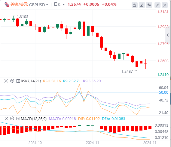 欧元:截止发稿,欧元/美元徘徊于1.0490附近。欧元/美元周二下跌,收报1.0488,跌幅0.06%。本周经济日历总体上是清淡的,周四的美国感恩节假期削弱了本周晚些时候的市场势头。美国市场周五的交易时间也将受到限制,进一步抑制本周出现大局的可能性。本周大部分时间里,欧盟数据点严重枯竭,新一轮欧洲统一消费者价格指数(HICP)通胀定于周五公布。技术面上,欧元/美元徘徊在1.0435–1.0450的支撑位和1.0525–1.0540的阻力位之间。RSI处于温和区域,如果出现合适的催化剂,则有足够的空间获得动力。