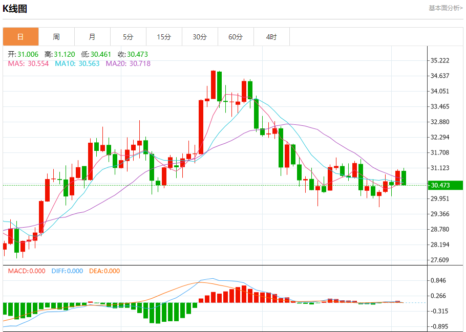 现货白银:截止北京时间21:13,现货白银下跌,现报30.47,跌幅1.73%。纽市盘前,自上午以来,白银价格显示出紧张的交易,这使得看涨趋势情景有效,因为今天没有任何变化,其下一个目标位于31.63美元,提醒您保持在30.63美元以上是重要的,以保证预期上涨的持续。