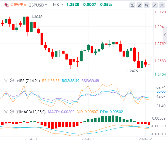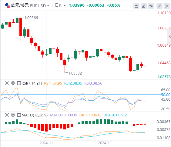 欧元:截止发稿,欧元/美元徘徊于1.0399附近。欧元/美元周一下跌,收报1.0405,跌幅0.21%。由于圣诞节前夕和节礼日等假期,本周交易日减少,预计交易量将减少。欧洲央行今年已将存款便利利率下调100个基点,预计明年将在欧元区经济风险加剧和通胀保持可控的情况下再次下调100个基点。几乎所有欧洲央行政策制定者都同意市场预期,即持续降息直至达到2%,他们认为这是一个中性利率,可以避免通胀低于央行2%的目标。技术面上,如果欧元/美元收于104.00水平下方,它将朝着最近的支撑位1.0330–1.0345前进。