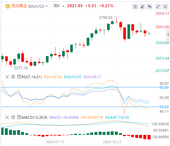 技术面:技术上,黄金呈现温和上涨趋势。价格正在接近关键枢轴点2621.54美元,这对于决定下一步走势至关重要。如果黄金能够突破这一水平,它可能会测试即时阻力位2652.23美元,并有进一步上涨潜力至2687.27美元。下行方面,支撑位在2587.60美元,如果跌破该水平,下一个支撑位在2560.19美元。50日均线在2620.20美元,与价格一致,而200日均线在2640.73美元,表明总体看跌,除非黄金能够突破支点并维持在2621.54美元上方的势头。