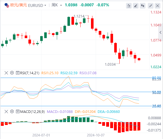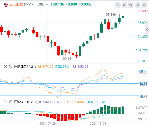 美元指数:截止发稿,美元指数徘徊在108.13附近。美元指数周一上涨0.4%,徘徊在两年高位附近,美元指数在五个交易日中第四日上涨,此间已累计上涨1.2%,降低了黄金对其他货币持有者的吸引力。交易员预计明年美联储将降息33个基点,表明他们认为美联储第二次降息25个基点的可能性不到50%,低于美联储上周预测的两次幅度为25个基点的降息。美联储决策者上周将2025年的降息预期从100个基点下调至50个基点,并上调了通胀预期。技术面上,突破直接阻力位108.54美元可能会推动该指数上涨至下一个阻力位108.90美元。不利的一面是,关键支撑位在107.60美元,进一步支撑位在107.18美元附近。50天EMA为107.64美元,200天EMA为106.48美元,也表明呈上升趋势。