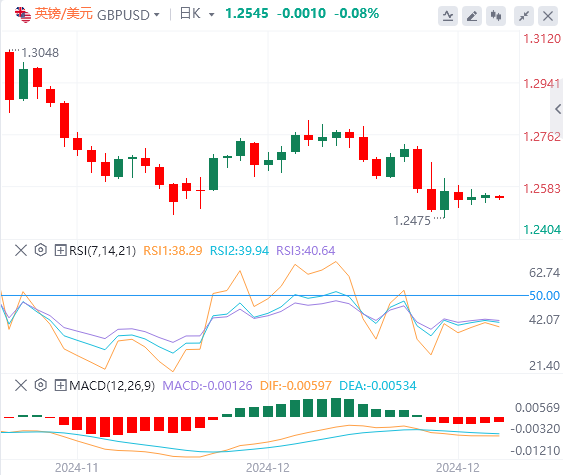 欧元:截止发稿,欧元/美元徘徊于1.0398附近。欧元/美元周三上涨,收报1.0405,涨幅0.02%。欧洲央行在2024年12月将利率下调25个基点,并表示“通胀正在向2%的中期目标持续靠拢”。同时,由于经济复苏速度放缓,欧洲央行或将加速政策宽松。欧洲央行行长拉加德指出,部分理事会成员甚至讨论过降息50个基点的可能性,这表明欧洲央行未来可能加快政策调整步伐。技术面上,50天EMA位于1.04121美元,略低于枢轴,表明存在一些看跌压力,但如果欧元/美元能够突破1.04465美元,它可能会转向更看涨的偏见。交易者应密切关注这些水平的价格走势信号。