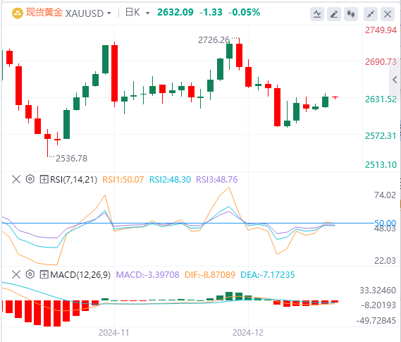 周五亚盘,黄金交投于2632.04附近。周四黄金价格上涨,受圣诞假期后清淡交投中避险需求的推动,市场正在等待特朗普政府上台后美国经济的表现,以及美联储2025年的利率策略。美国总统乔·拜登周三表示,他谴责俄罗斯在圣诞节当天对乌克兰部分城市及其能源系统发动袭击,并要求美国国防部继续向乌克兰增加武器运送。