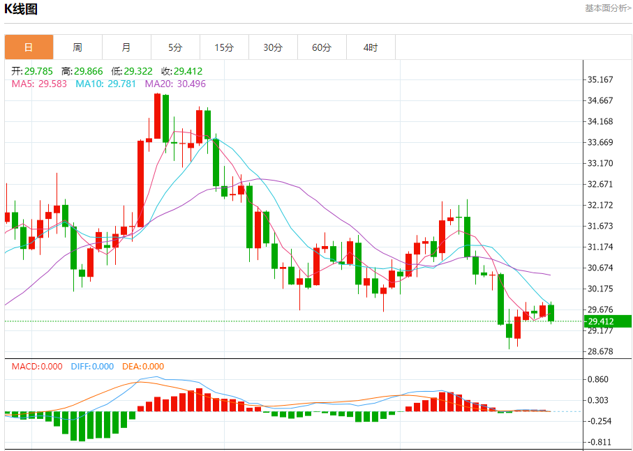 现货白银:截止北京时间21:20,现货白银下跌,现报29.419,跌幅1.23%。纽市盘前,白银价格波动,小幅上涨至29.63美元上方,注意EMA50对价格形成了良好的阻力,而随机指标现在显示出明显的负面信号。
