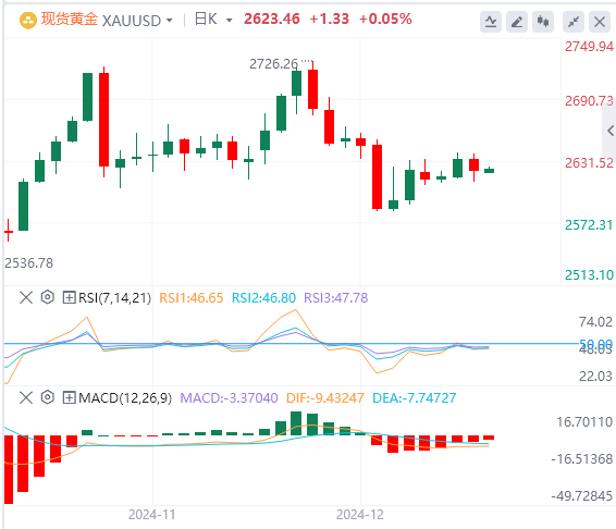 周一亚盘,黄金交投于2623.46附近。唐纳德-特朗普(DonaldTrump)的关税和贸易政策可能引发贸易冲突,为黄金提供支持。不过,美联储(Fed)2025年降息次数减少的前景可能抑制黄金价格的上行空间。新年假期前的交易量较平时清淡。