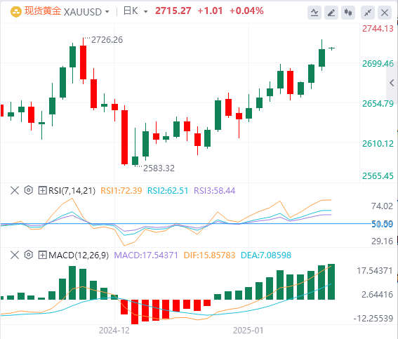 周五亚盘,黄金交投于2715.27附近。金价周四升至一个多月高点,盘中最高曾触及2724.61美元/盎司,距离12月12日触及的逾两个月高点2726.05不远,收报2714.49美元/盎司,为连续第三个交易日上涨,因最新的美国经济数据进一步压低美债收益率,本周核心通胀数据疲软,增加了市场对美联储政策将更加鸽派的押注。