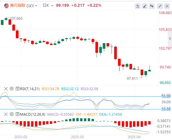 美元指数周二从三年低点反弹后,在98.50附近交易。反弹之际,市场刚刚结束周一复活节假期,重新评估了更广泛的宏观前景。特朗普威胁要解雇美联储主席鲍威尔,继续削弱人们对美国货币政策的信心。技术指标显示深度超卖,阻力位在100.01和101.30附近,限制了上行空间。