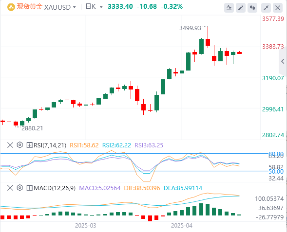 周二亚盘,黄金交投3333.40附近。在美元小幅反弹以及美中紧张局势缓和的情况下,黄金小幅走低。中国周五免除了部分美国进口商品的125%关税,这增加了美中贸易战接近结束的希望,尽管中国迅速推翻了美国总统唐纳德·特朗普关于两国之间正在进行谈判的说法。