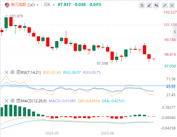 周二,因特朗普宣布伊以停火的消息打击了 避险买盘,美元指数亚盘、欧盘持续下跌近 0.50%,失守98关口,截至目前,美元报价97.93。