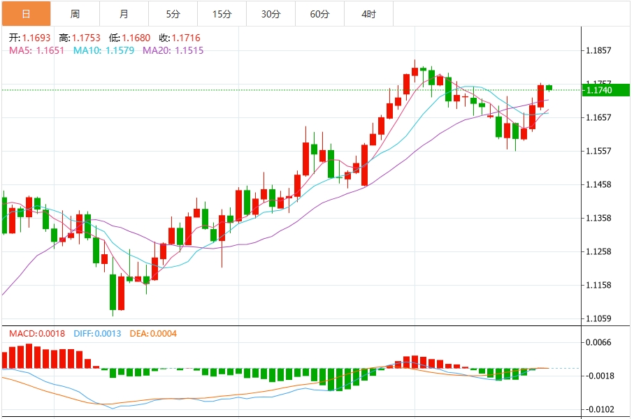 欧元:截止发稿,欧元/美元徘徊于1.1764附近,周四即将公布的欧洲央行利率决议将成为本周焦点,市场情绪转趋谨慎,汇价可能维持震荡整理格局。从日线图来看,欧元兑美元整体呈上升趋势,自低点1.1065反弹以来,汇价逐步构筑抬高的底部与高点,并维持在布林带中轨及其上方波动。当前布林带指标显示中轨位于1.1673,布林上轨为1.1855,下轨为1.1491,带宽适中,表明市场波动率尚未大幅收敛。分析认为汇价短线进入震荡整理阶段,支撑位关注1.17,该位曾为前期重要突破平台。