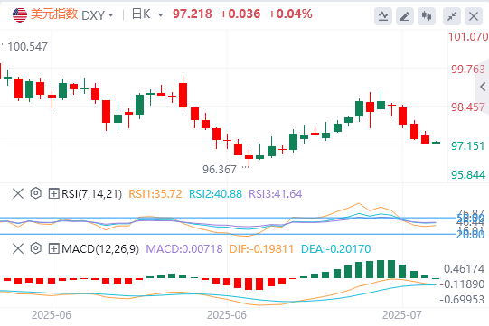 7月24日,北京时间周三亚市早盘,美元指数徘徊在97.21附近。周三,随着美国与更多贸易伙伴达成协议,市场避险情绪降温。美元指数依旧疲软,最终收跌0.16%,报97.162。美债收益率全线回升,基准的10年期美债收益率收报4.388%,2年期美债收益率收报3.886%。现货黄金连涨三日后回调,在传出欧美接近达成协议的消息后加速下挫,一度接近3380美元关口,最终收跌1.29%,收报3387.23美元/盎司;现货白银持稳在39美元关口上方,最终收跌0.07%,报39.27美元/盎司。由于贸易谈判的进展缓解了油市需求担忧,国际油价接近收平。WTI原油在65美元关口附近横盘震荡,最终收跌0.18%,报65.22美元/桶;布伦特原油收平,报68.06美元/桶。