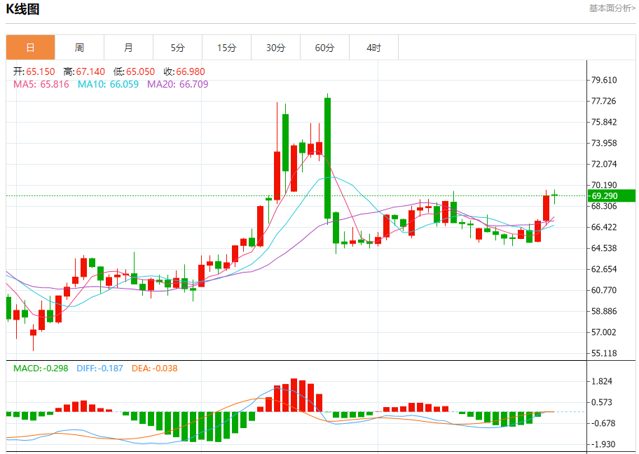原油市场:截止北京时间20:23,美油上涨,现报69.340,涨幅0.20%。纽市盘前,(原油)价格在最后一个交易日下跌,以收集最后的收益,并试图获得可能有助于其恢复和再次上涨的积极势头,并试图摆脱(RSI)上明显的超买状态,特别是在那里开始出现负面信号的情况下,在短期基础上主要看涨趋势占主导地位,并沿着一条斜线交易,由EMA50上方的持续交易支撑,加强了其恢复的机会。