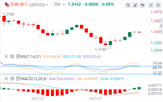 英镑:截止发稿,英镑/美元徘徊在1.3442附近。英镑上周五上涨0.06%,至1.3451美元,早些时候曾触及两周高点1.3458美元。英国央行上周四下调了利率,但以5:4的微弱票数通过,显示出对宽松政策缺乏信心。技术面,如果英镑/美元收于1.3450上方,则将向阻力位1.3485–1.3500移动。RSI接近超买区域,但短期内有足够的空间获得动力。