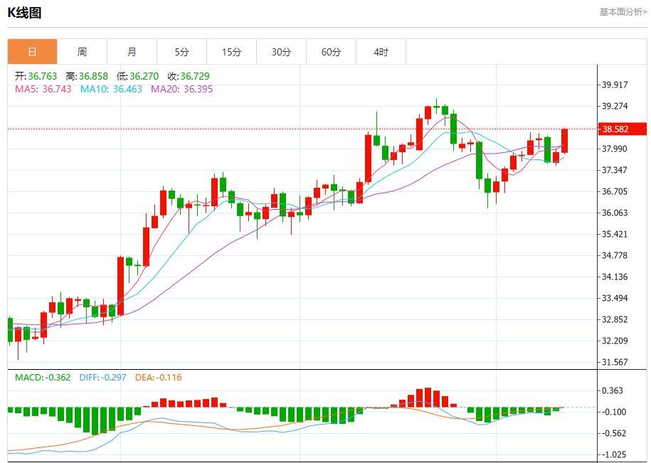 现货白银:截止北京时间20:23,现货白银上涨,现报38.572,涨幅1.81%。纽市盘前,(白银)价格延续了其在最近一个交易日的强劲涨势,达到了我们早上的目标38.50美元的阻力,并以强烈的迹象攻击该阻力,初步迹象表明,尽管达到了超买水平,但价格仍在(RSI)的积极信号支持下收于该阻力上方,主要看涨趋势占主导地位,短期内沿着一条小斜线交易,此外,来自EMA50上方交易的积极压力继续存在,加强了这种情况在短期内的稳定性。