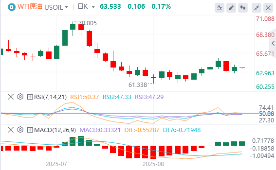 技术面:从日线走势来看,WTI原油在63美元附近形成阶段性支撑,但上方65美元至66美元区间存在明显压力。技术指标显示,短期均线趋于走平,MACD动能柱缩窄,RSI维持在中性区域,显示市场缺乏明确方向。若价格有效突破66美元,则有望进一步上探68美元一线;但若跌破63美元支撑,则可能重新测试60美元关口。整体格局表现为区间震荡,等待基本面消息的进一步指引。