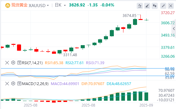 技术面:金价上涨趋势在触及3674美元/盎司的历史高位后停滞不前,随后回落至3650美元/盎司以下。随着金价周二收盘下跌,金价后市测试3600美元/盎司是有可能的。如果黄金进一步走弱,卖家下一个目标将是4月22日高点3500美元/盎司。相对强弱指数(RSI)目前处于超买状态,但尚未达到80的关键阈值,这表明黄金的看涨趋势仍然完好无损。上行方面,如果黄金价格有效突破3674美元/盎司,接下来的目标将是3700美元/盎司,然后是3750美元/盎司和3800美元/盎司。