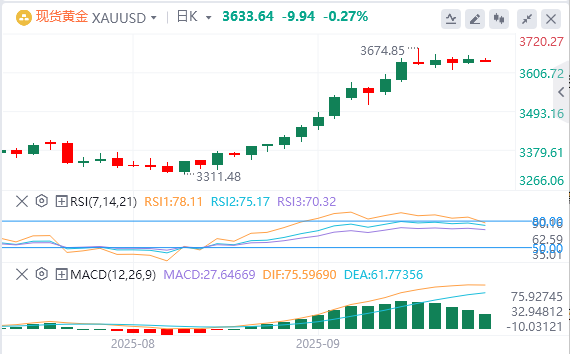 周一亚盘,黄金徘徊在3633.64附近。上周黄金突破3670美元创下历史新高后进入盘整阶段。接下来,美联储的政策决定可能决定黄金是否还有进一步上涨空间,尽管从技术面来看已处于超买状态。展望本周,经济日历堪称“超级周”,多重重磅事件将搅动黄金风云。周一,纽约制造业调查率先登场,揭示区域经济脉动;周二,8月零售销售报告将检验消费韧性。周三,8月房屋开工与建筑许可数据出炉,紧随加拿大银行货币政策决定;所有目光聚焦华盛顿——美联储利率公告与鲍威尔新闻发布会,将决定降息幅度与鸽派基调。周四,英国银行政策决定后,美国每周失业救济与费城联储制造业调查接棒;周五日本银行决策收官。这一系列事件,不仅考验美联储的就业倾斜,还可能放大全球流动性预期,推动黄金进一步突破。