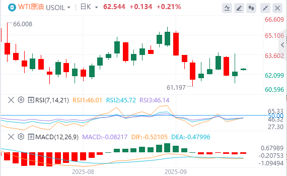 技术面:原油从日线图级别看,K线连续收阴止步后,形成一个窄幅区间的底部,油价反复穿越均线系统,中期客观趋势震荡格局。周一油价一度跌破区间下沿,尚未形成有连续性有力度的向下趋势,预计原油中期走势维持弱势震荡整理格局。原油短线(1H)走势上涨结束,油价掉头回落向下重回62下方。均线系统呈空头排列,短线客观趋势方向向下。MACD指标在零轴下方张口向下,空头动能表现充盈。早盘走势仍处于主趋势向下节奏,油价不断创新低。预计日内原油走势将持续下落,空间有限。