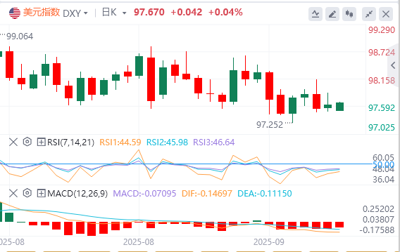9月15日,北京时间周一亚市早盘,美元指数徘徊在97.67。上周五,因市场等待本周四的美联储利率决议,美元指数总体呈震荡趋势,最终小幅收涨0.12%,报97.62。基准的10年期美债收益率收报4.0700%,2年期美债收益率收报3.5620%。随着以色列空袭卡塔尔和俄罗斯无人机进入波兰领空,全球两大地缘冲突再度升级,现货黄金突破1980年通胀调整历史峰值,周线连续第四周上涨,最终收涨0.26%,报3643.06美元/盎司;现货白银触及每盎司42.26美元的14年最高,最终收涨1.53%,报42.16美元/盎司。乌克兰无人机袭击导致俄罗斯西部最大港口暂停装货,国际油价上涨。WTI原油冲高回落,最终收涨0.58%,报62.59美元/桶;布伦特原油最终收涨0.83%,报66.87美元/桶。