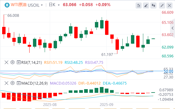 技术面:自2025年6月(由以伊冲突触发的)油价高点以来,美原油10月期货合约价格始终处于三角形整理形态内运行。价格走势呈现“高点下移、低点上移”的典型整理特征,且始终未跌破61美元关键支撑位。若油价实现对70.20美元的有效突破,将大概率扭转长期趋势,从“整理震荡”阶段切换至“潜在看涨反转”阶段。若油价受到OPECOPEC+如期增加原油供给,油价未能有效守住61美元支撑位,将面临重新测试2025年低点的压力,关键支撑位依次为:60.20美元、59.20美元、58.00美元。