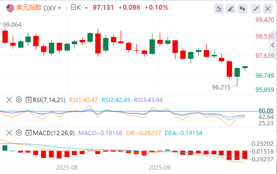 美联储利率决议宣布之后,美元指数短线跳水,但在随后的新闻发布会上,鲍威尔称这是“风险管理” 的降息,美元指数随即反弹并收复97美元关口,截至目前,美元报价97.13。