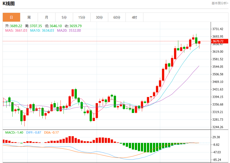 现货黄金:截止北京时间20:23,现货黄金上涨,现报3670.76,涨幅0.30%。纽市盘前,(黄金)价格在最后一个交易日上涨,此前因其依赖于EMA50的支撑而获得强劲的看涨提振,在达到超卖水平后,相对于价格走势,尤其是在短期内主要看涨趋势占主导地位的情况下,相对强度指标上出现的积极信号加强了看涨势头。