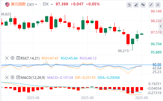 9月19日,北京时间周五亚市早盘,美元指数徘徊在97.39。周四,美国公布的初请失业金人数创下近四年来的最大降幅,扭转了前一周的大幅增长(注:数据公布数小时后,消息称北卡罗来纳州的续请数据被错误地大幅低估逾1.9万人,劳工部一名发言人表示仍在调查此事)。美元指数收复97关口,最终收涨0.35%,报97.36。基准的10年期美债收益率收报4.1080%,对美联储政策利率敏感的2年期美债收益率收报3.5740%。受利空的初请数据影响,现货黄金最多跳水逾40美元,最终收跌0.41%,收报3643.75美元/盎司;现货白银在下跌后回升,几乎收复失地,最终收涨0.35%,报41.79美元/盎司。因作为全球最大石油消费国的美国存在的供应过剩和燃料需求疲软的担忧,国际原油延续周三跌势。WTI原油最终收跌1.03%,报63.30美元/桶;布伦特原油最终收跌0.6%,报67.51美元/桶。