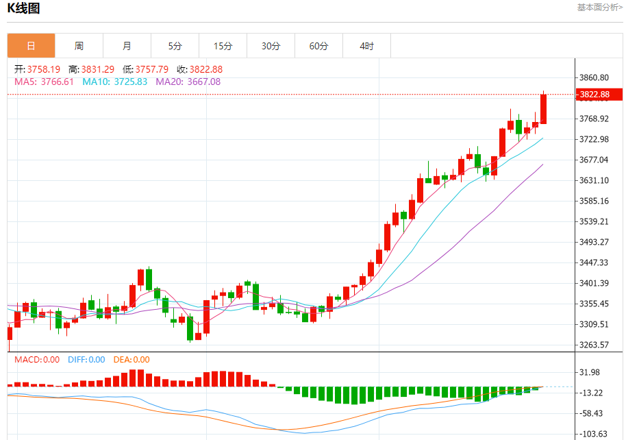 现货黄金:截止北京时间20:23,现货黄金上涨,现报3822.04,涨幅1.62%。纽市盘前,(黄金)价格在最后一个盘中交易中上涨,历史上第一次超过3800美元,受到其在EMA50上方连续交易的支持,并在短期主要看涨趋势的主导下,以及其沿着支撑趋势线交易,除了相对强度指标出现积极信号外,尽管达到了超买水平。