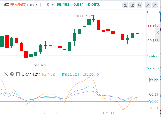 周一,得益于美联储12月降息预期降温,美元指数延续反弹,截至目前,美元报价99.48。