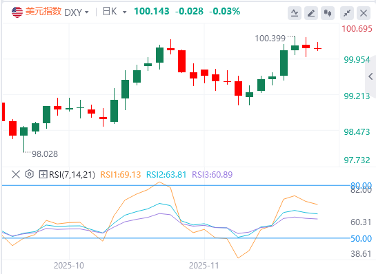 上周五,尽管美联储“三把手”鸽派发言令12月降息预期有所回暖,但美元指数维持坚挺,盘中创近6个月新高,截至目前,美元报价100.13。