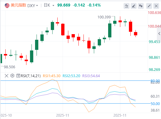 周二,由于不及预期的零售销售数据强化了市场对美联储12月降息的预期,美元指数高位回落,跌破100关口,截至目前,美元报价99.66。