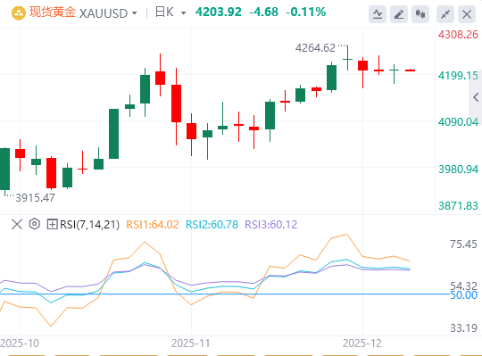 技术面:黄金依然偏向上涨,日内收盘价突破4200美元为价格上涨铺平了道路。相对强弱指数(RSI)依然看涨,但有所趋于平稳,显示盘整,交易者等待新的催化剂。如果黄金突破4250美元,可能尝试冲击4300美元,下一个目标是历史最高4381美元。另一方面,如果黄金跌破4200美元,支撑位是20日简单移动平均线(SMA)4124美元,随后在50日均线4059美元前方有4100美元支撑位。