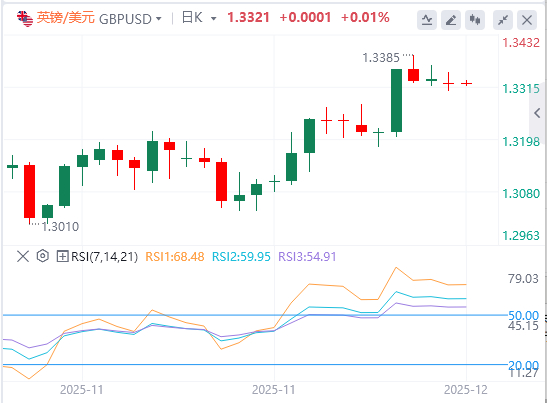 英镑:截至发稿,英镑/美元徘徊在1.3321附近。英镑/美元周一在1.3300关口附近徘徊,未能在任何一侧找到动力,开启了新一周的交易。广泛市场情绪主要依赖于即将到来的美联储(Fed)利率决策,投资者在今年最大的一次利率决策前不愿过于偏向看涨或看跌。本周英国经济数据日历相对平静,但英镑交易将为下周繁忙的发布日程做好准备,最终可能迎来英国央行(BoE)的降息。技术面上,英镑/美元价格仍困在1.3360–1.3375的强阻力位下方,交易者等待更多催化剂。成功测试1.3360至1.3375阻力将为测试下一个阻力1.3475至1.3490打开道路。