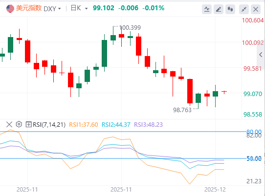 12月9日,北京时间周一亚市早盘,美元指数徘徊在99.10附近。周一,美联储鹰派降息预期推动美元上涨,美元指数尾盘拉升,最终收涨0.13%,报99.11;基准的10年期美债收益率最终收报4.1670%,对美联储政策利率敏感的2年期美债收益率收报3.5810%。受美元指数美盘走强影响,现货黄金一度回落30美元,最终收跌0.15%,报4190.68美元/盎司;现货白银最终收跌0.25%,报58.15美元/盎司。市场关注印度购买俄罗斯原油的情况,成品油大跌拖累国际油价走低,WTI原油最终收跌2.16%,报58.83美元/桶;布伦特原油最终收跌2.18%,报62.45美元/桶。