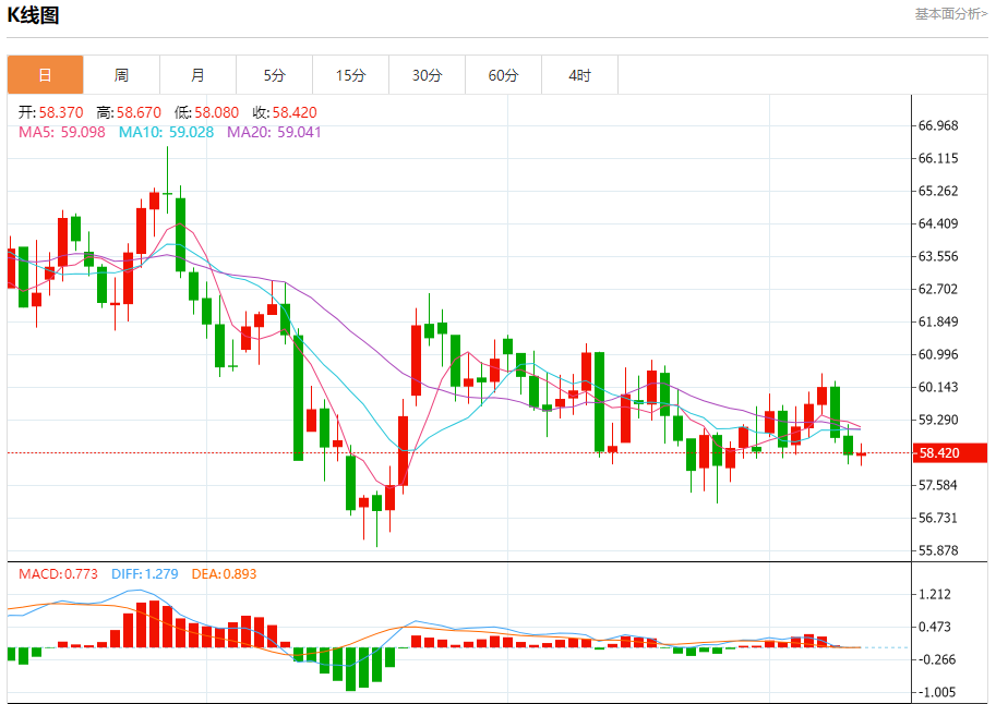 原油市场:截止北京时间21:20,美油上涨,现报58.380,涨幅0.24%。纽市盘前,(原油)价格在最近一个交易日的水平上波动交易,在达到超卖水平后,由于关键支撑58.20美元的稳定性而即将出现的看涨势头和相对强度指标的负面信号之间波动,伴随着由于交易低于EMA50而产生的持续负面压力,受上升楔形模式所代表的短期负面技术形态的影响。